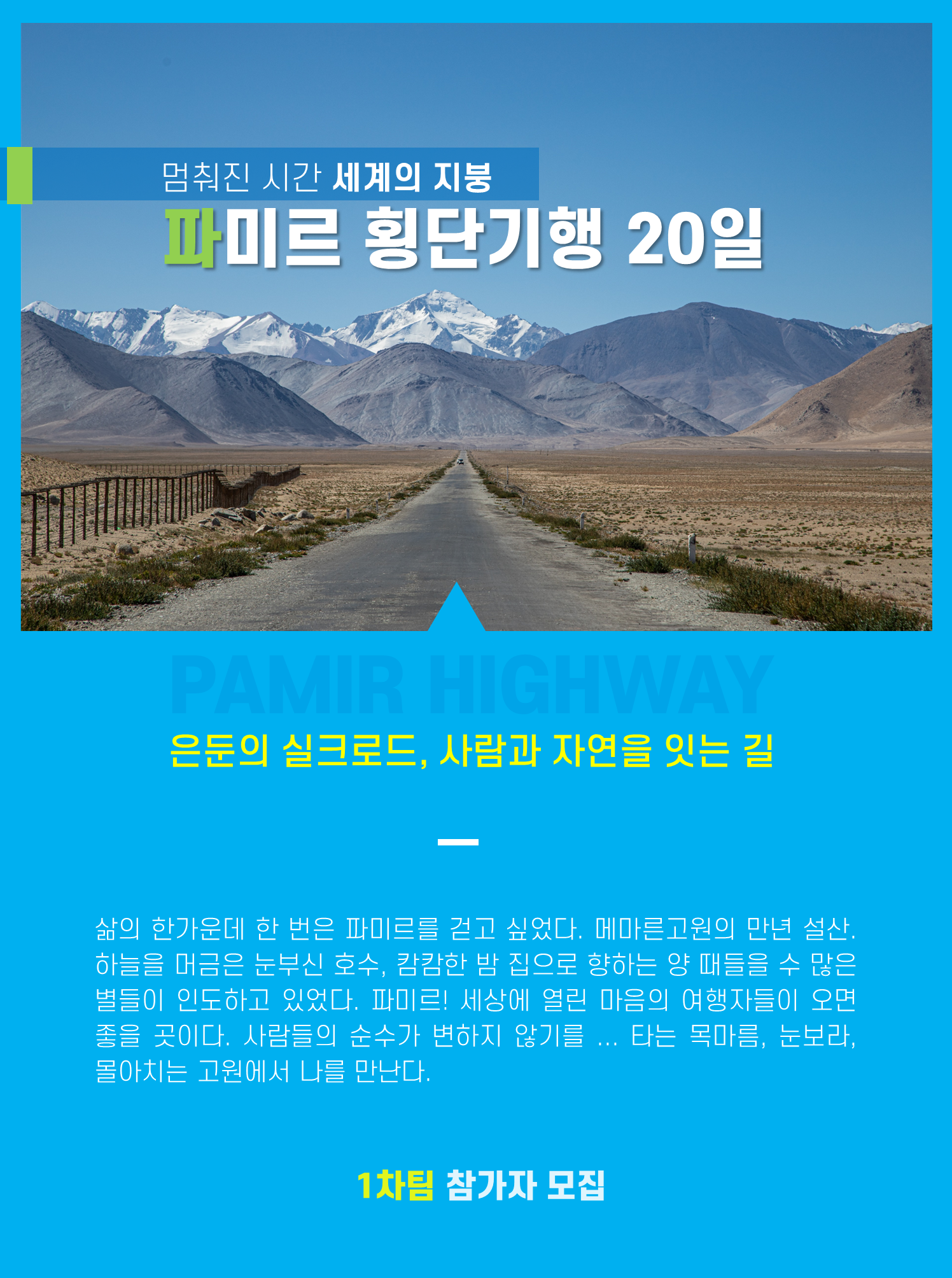 카라코람, 힌두쿠시, 파미르! 이름만 들어도 가슴을 뛰게 한다. 오지를 찾는 여행자들이 마지막에 이르게 되는 곳이다. 낯선 곳에서 예상을 벗어난 상황을 만날 때, 진짜 여행이 시작된다. 두려움도 있지만 익숙해지게 마련이다. 주인공을 빛내주는 조연들을 만난다. 사람들과의 만남은 그리움으로 남게 된다. 배낭을 꾸리는 것은 여행자의 의식이다. 필요한 물건을 빼고 넣고를 반복한다. 삶의 쉼표가 필요한 순간이 온다. 나에게 집중 할 수 있는 시간이 필요하다. 자연이 선사하는 축복의 땅! 중앙아시아의 고원, 마음 한편 저장해두었던 파미르로 향한다.