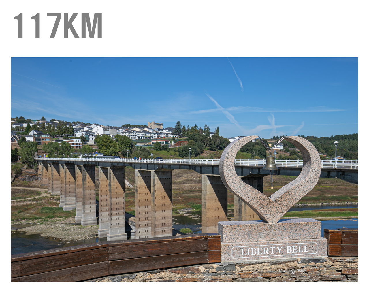 23km 걷기에 쉬운 구간. 순례자의 수가 많아지는 구간. 초원과 과수원, 철길, 작은 개울을 건넙니다. 참나무 그늘 아래 조용한 시골길을 따라 조용히 산책. 갈리시아 전통 곡물 창고(호로레스)를 보게 됩니다. 남은 거리를 알려주는표지석들이 자주 보입니다. 100KM 표지석에서 기념 사진을 찍어보세요! 남은 여정의 아쉬움이 느껴집니다. 미노(MIno)강 언덕 흰색 지붕으로 빛나는 포르토마린. 프랑스 길의 아름다운 마을 중 하나. 1962년 댐이 건설된 후 마을이 수몰되고 언덕위에 세운 마을. 현대적인 다리 아래 로마 시대의 다리가 숨어 있습니다. 수위가 낮은 건기 옛 마을의 흔적을 볼 수 있습니다.