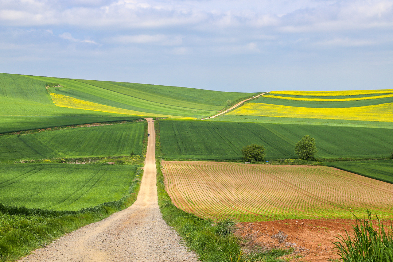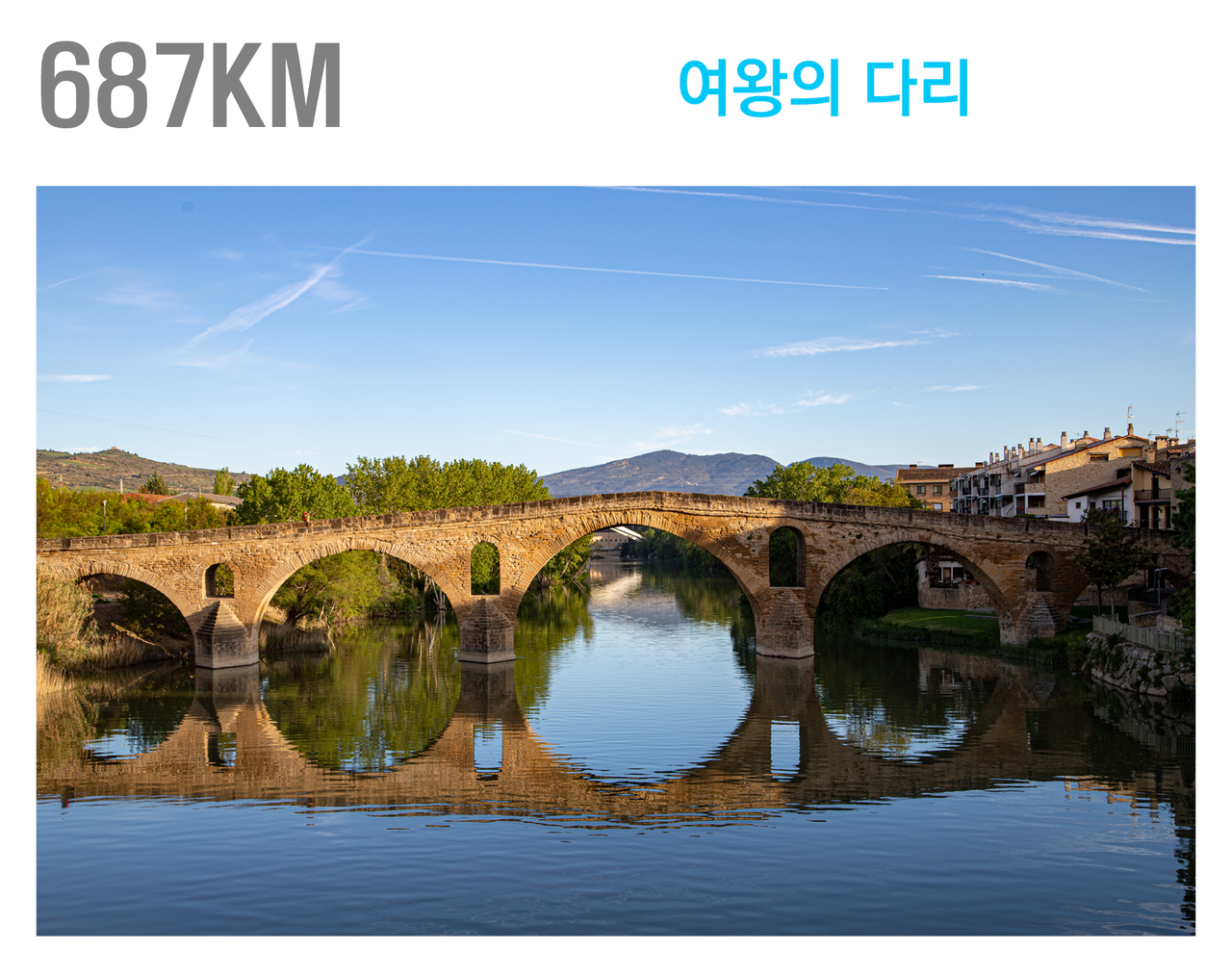 축제의 도시 팜플로나에서 휴식을 취하셨나요? 자연의 길을 걷습니다. 공원과 나바라 대학교를 지납니다. 한적한 초원 길, 능선 위에 하얀 풍력발전기. Alto de Perdon(용서의 언덕)에서 장엄함 순례자 기념비와 풍경 조망. 팜플로나와 피레네 산맥을 뒤돌아보며 앞으로 가야 할 대지와 내리막이 펼쳐집니다. 무르자발(Muruzabal)에서는 갈림길이 푸엔테 라 레이나로 이어집니다. 카미노에서 만나는 가장 아름다운 여왕의 다리 도착