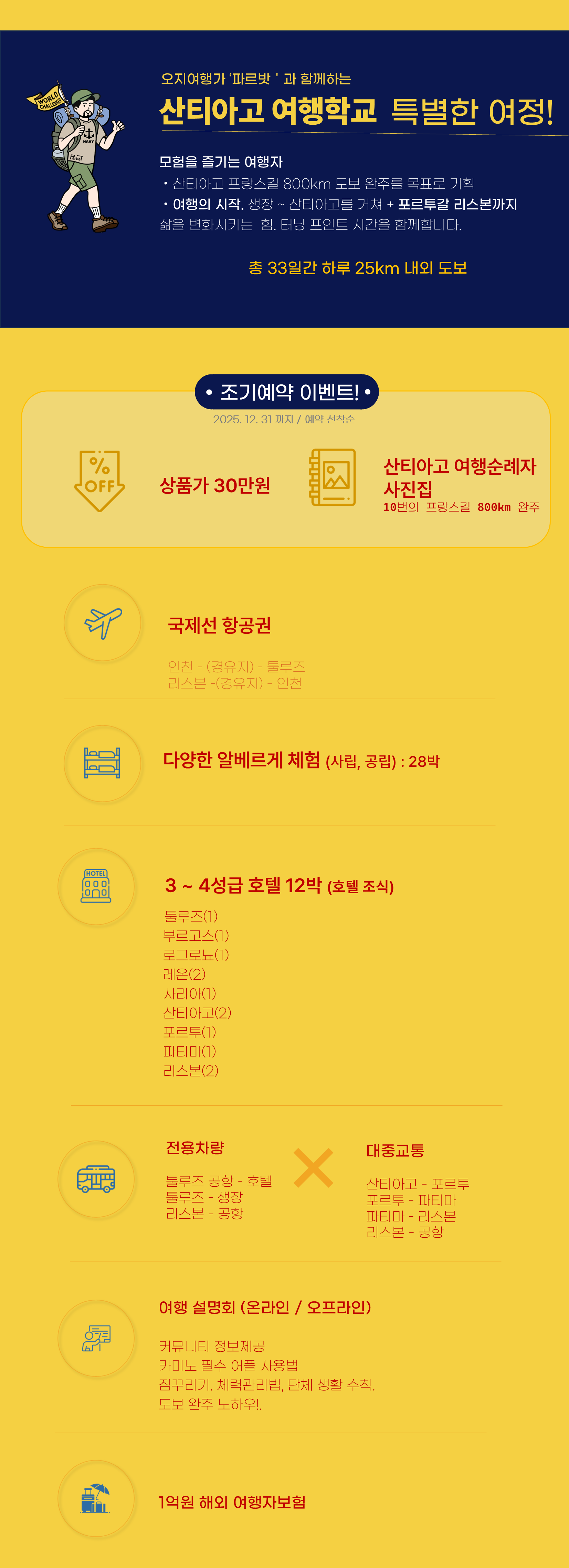 모험을 즐기는 여행자의 800km 도보 완주 목표로 기획되었습니다. 여행의 시작에서 포르투갈 리스본까지 일정을 함께하며, 팀원들의 여행 안전을 도모합니다. 산티아고 순례는 내면을 성찰하는 삶의 터닝포인트가 시간입니다. 인생의 가장 의미 있는 순간. 진정한 여행 순례자가 되어봅니다. 800km 완주를 목표로 자신감을 얻고 큰 성취감을 느낄 수 있길 응원합니다. 산티아고 순례 그후. 포르투갈은 아기자기한 도시 기행 최고의 여행지입니다. 한국 여행자들에게 인기있는 포르투 / 파티마 / 리스본에서 대항해 시대 화려했던 중세의 시간을 거닐어 봅니다.