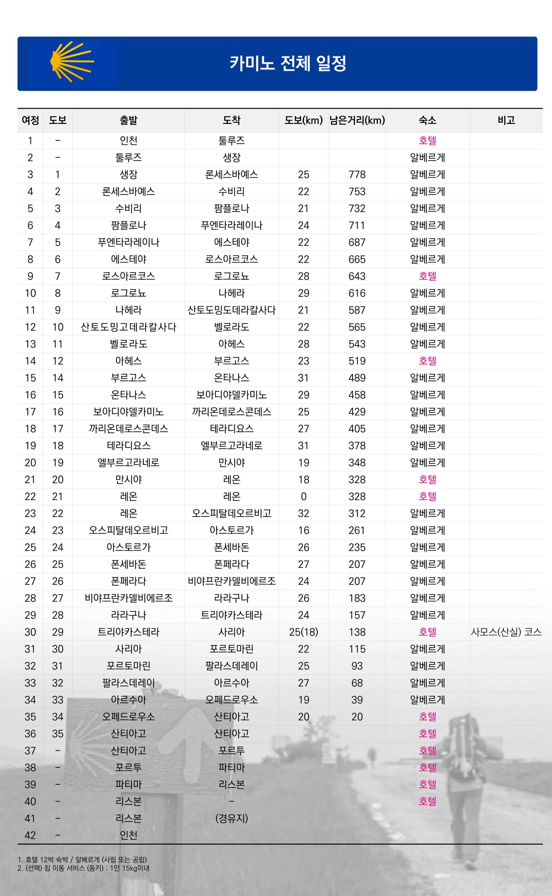 숙소 : 알베르게 조 : 호텔식 / 중 : 현지식 / 석 : 불포함 |